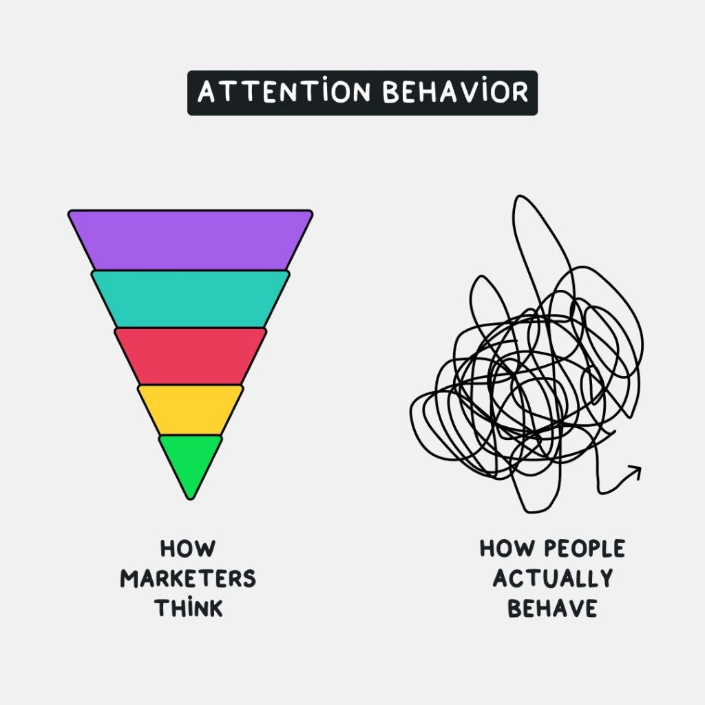 Όταν οι Μαρκετίστες συνηθίζουν να σκέφτονται σε μορφή funnels, μια σειρά από βήματα που καθοδηγούν τον χρήστη από την επαφή μέχρι την αγορά, η εικόνα συνήθως φαίνεται πολύ καθαρή και οργανωμένη. Όμως, στην πραγματική ζωή, όταν έχουμε να κάνουμε με ανθρώπους, η κατάσταση μοιάζει περισσότερο με ένα μπερδεμένο κουβάρι, παρά με έναν γραμμικό δρόμο!(βλ. εικόνα άρθρου)